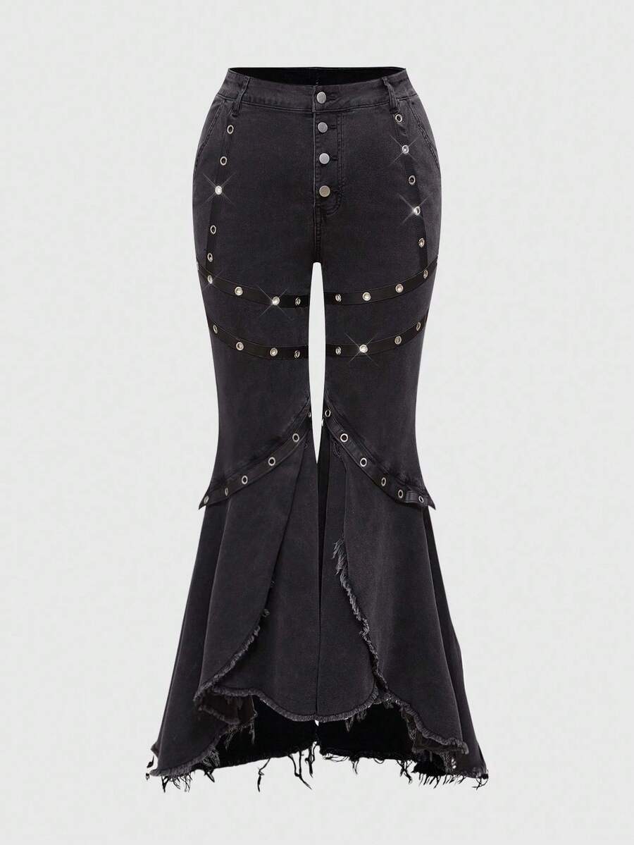 Goth جينز مقطع غير متماثل مع حافة مفلطحة، مزين بالنيتات والجلد، مقاس كبير للخريف/الشتاء، بنطلونات جينز مقاس كبير للنساء للخريف، بنطلونات جينز مقاس كبير للنساء للخريف/الشتاء، للارتداء اليومي الكاجوال، جينز مقاس كبير مغسول بطريقة عتيقة مع تفاصيل مقطعة ومزينة بالنيتات