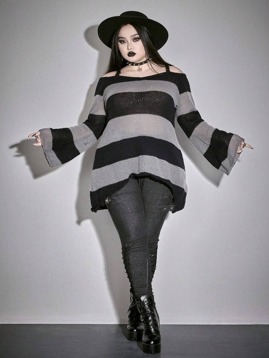Grunge Punk كنزة صوفية كنزة طويلة الأكمام فضفاضة بأكتاف مكشوفة مخططة باللونين الأسود والرمادي، مناسبة للخريف والشتاء، مقاسات كبيرة