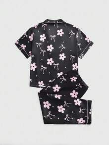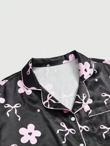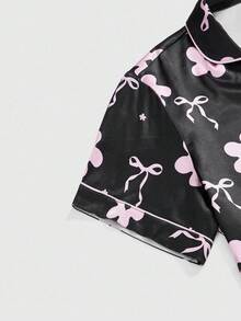 Kawaii بيجامة قصيرة الأكمام مع طبعات زهور وفيونكة، مريحة وكاجوال للصيف