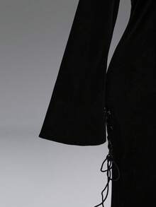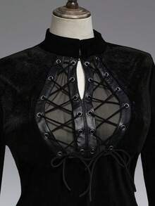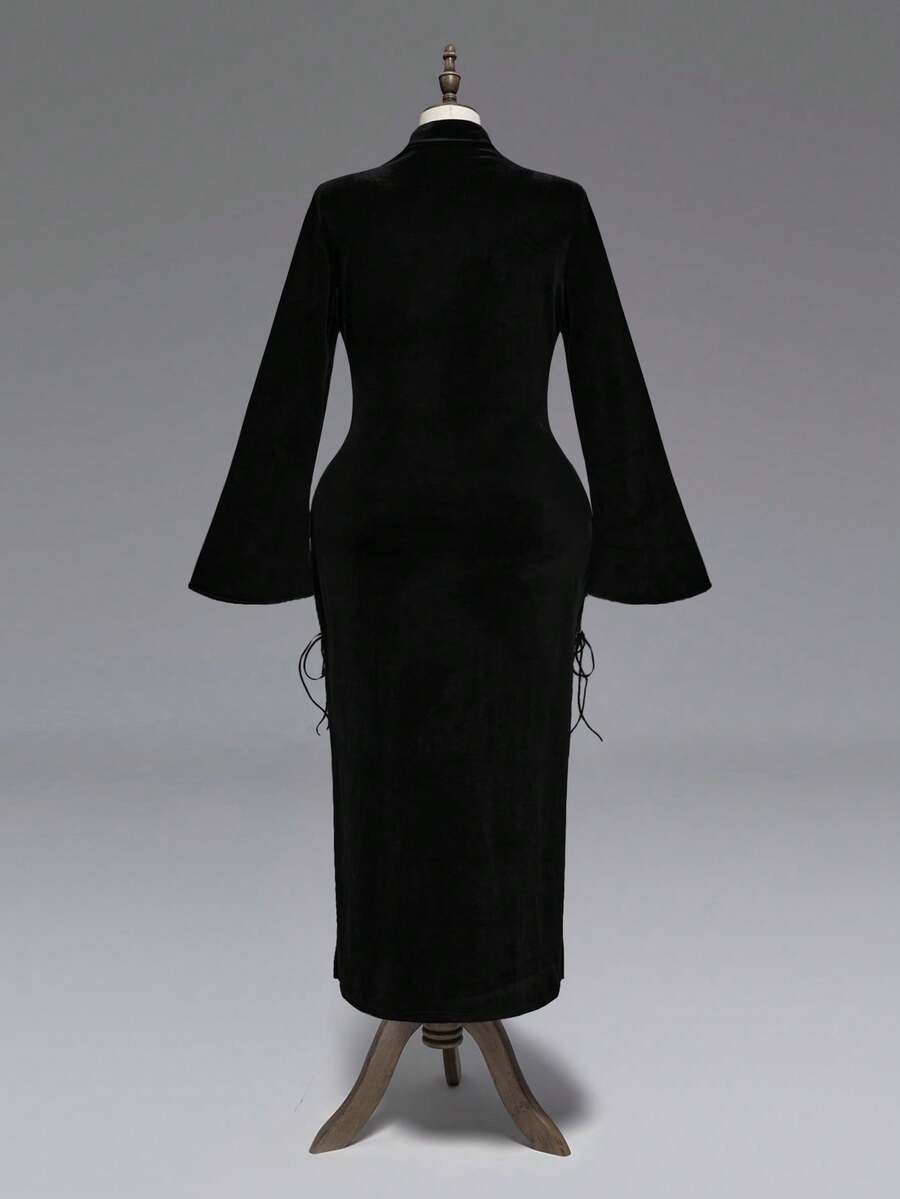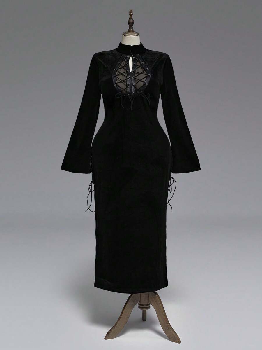 Goth فستان أسود طويل بأكمام واسعة وتفاصيل دانتيل مفتوحة في الصدر للمقاسات الكبيرة، فستان ضيق بأكمام واسعة للمقاسات الكبيرة، فستان أسود مخملي طويل للخريف/الشتاء للمقاسات الكبيرة