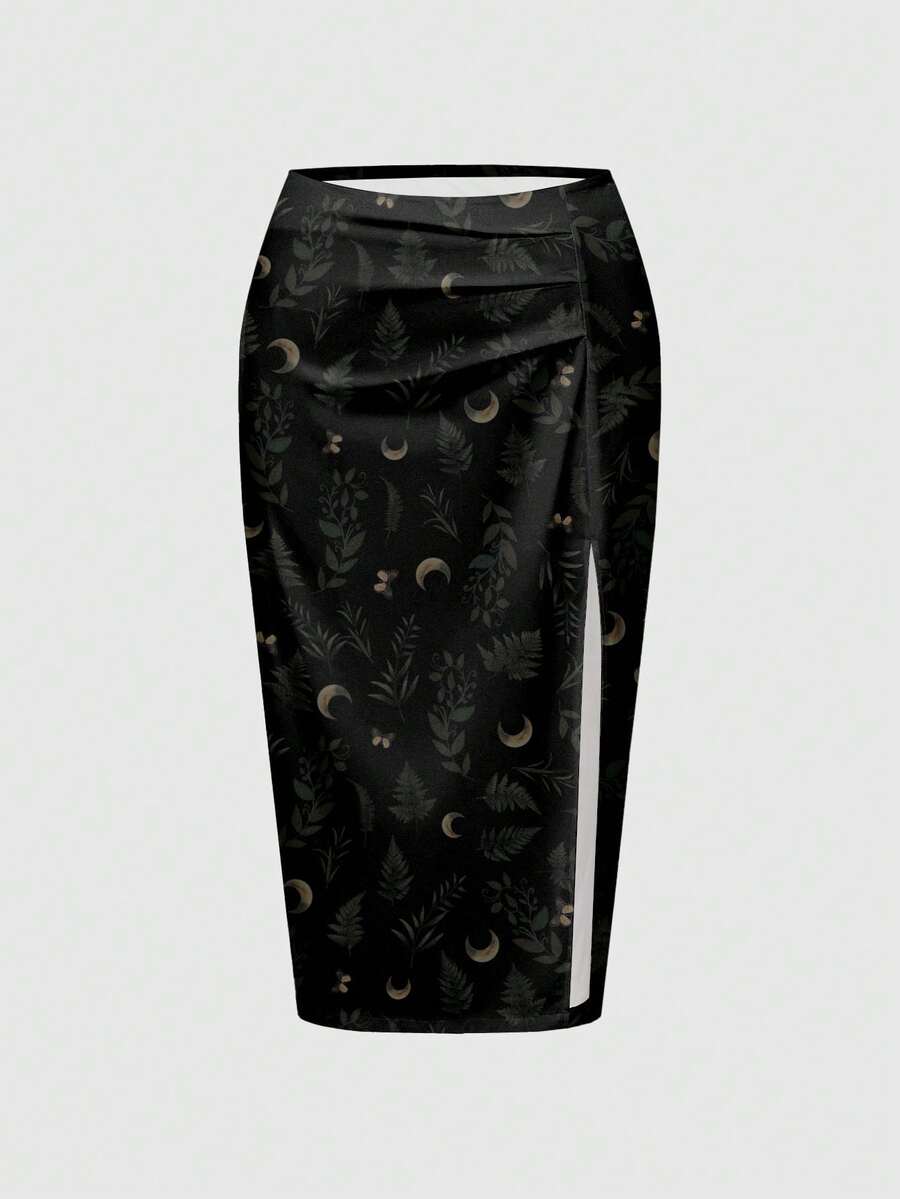 Goth تنورة طويلة بشق عالي بطراز جوثي داكن مطبوع بأوراق الشجر والشمس والقمر، مقاسات كبيرة