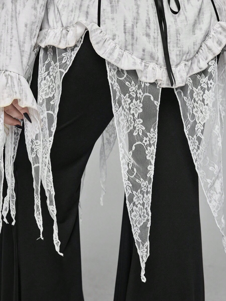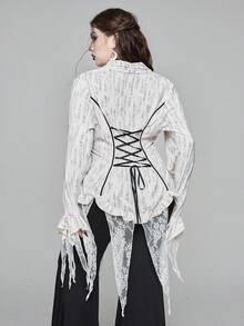 Goth قميص أبيض مزخرف بنسيج الدانتيل غير متماثل الذيل، قميص جاكيت نسائي أنيق بأكمام طويلة وتصميم متدفق للذيل من الدانتيل للخريف والشتاء للمقاسات الكبيرة