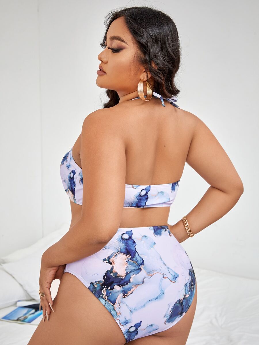 مجموعة بيكيني عنق مربع طبعة رخامية للمقاسات الكبيرة لصيف الشاطئ