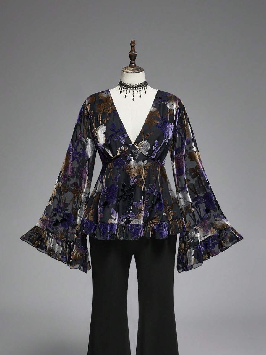 Goth ملابس علوية ذات أكمام واسعة وياقة على شكل حرف V مع نسيج مخمل ذو تأثير أومبير وزهور ولمعان للمقاسات الكبيرة
