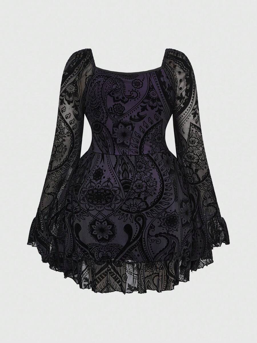 Hippie فستان مربع الرقبة ذو أكمام واسعة مزخرفة بطراز رجعي رومانسي هيبي، مشدود الخصر