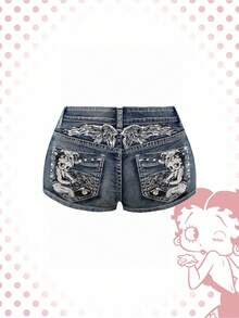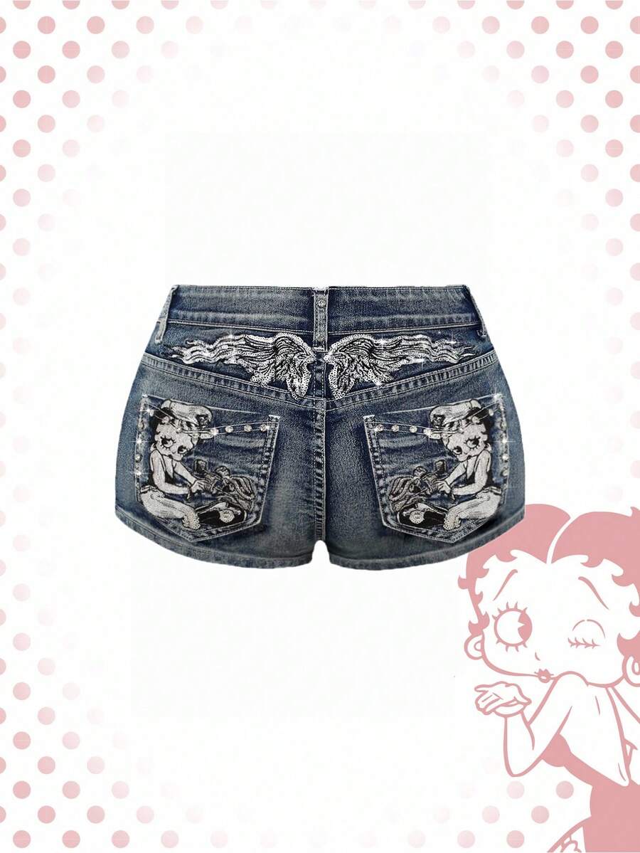 Betty Boop | ROMWE شورت جينز مطرز بتصميم فينتاج لأحجام كبيرة