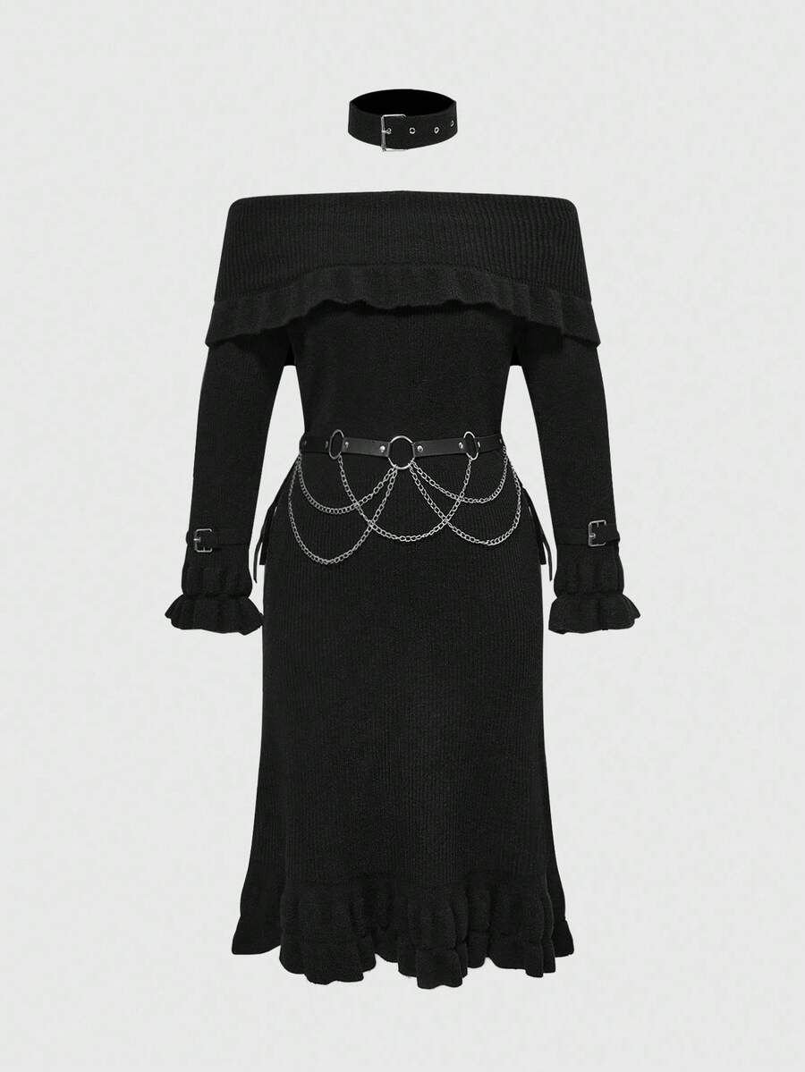 Goth فستان كنزة صوفية حجم كبير للنساء بطراز جوثيك ريترو جرانج-بانك أنيق، ذو ياقة مكشكشة وأكتاف مكشوفة وأكمام مكشكشة، مع حزام جلدي وسلسلة معدنية جوثيك للخصر، فستان كنزة صوفية شتوي/خريفي باللون الأسود، فستان كنزة صوفية عتيق للنساء بطراز الموضة