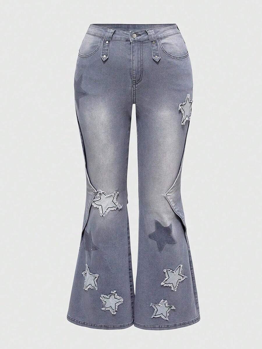 Grunge Punk سراويل جينز مناسبة للمرأة البدينة بتصميم بنطلون ضيق مثير وواسع في الأسفل بطبعات نجمية مطرزة، مناسبة للارتداء اليومي والحفلات الموسيقية والتصميم الإبداعي