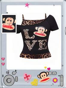 Paul Frank X ROMWE قميص تي شيرت مطبوع بنمط الفهد والكرتون غير متماثل الياقة مناسب للمقاسات الكبيرة، طراز كاجوال صيفي عصري للشارع من نمط K-pop وY2K