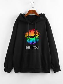هودي حراري برباط منخفض الكتف بجيب الكنغر بطباعة شفاه وشعار مقاس كبير