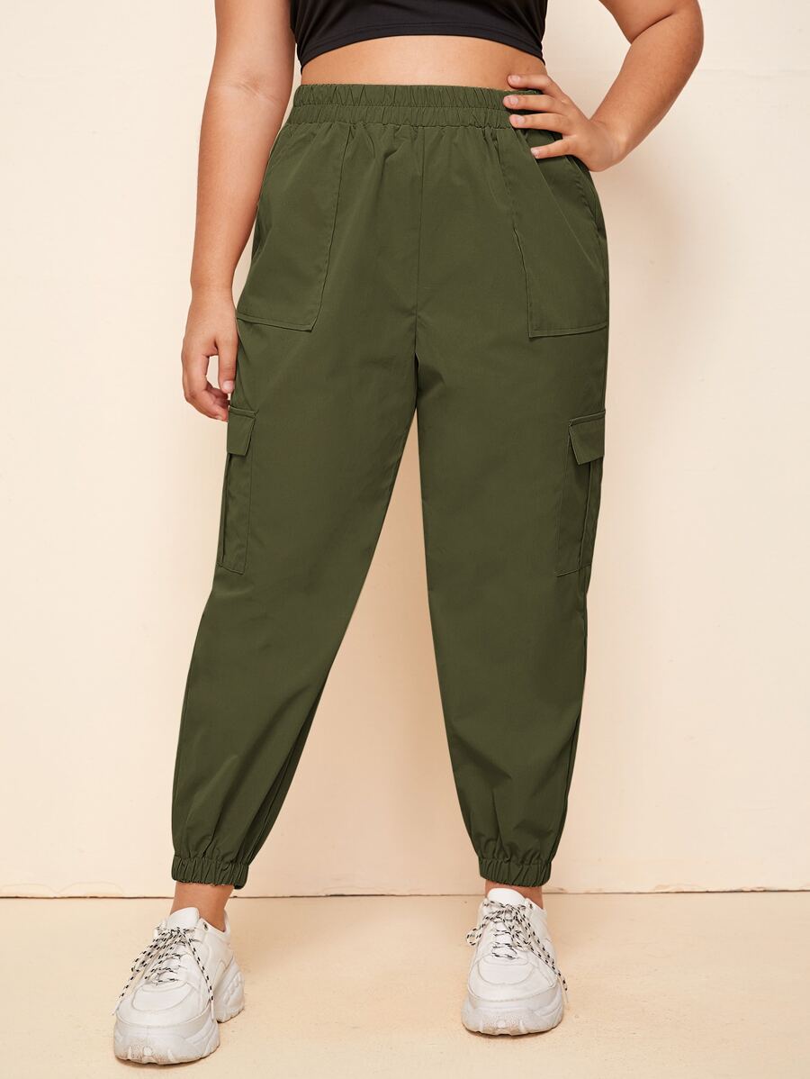 سروال كارجو مقاس كبير بجيب رفرف وبلون موحد