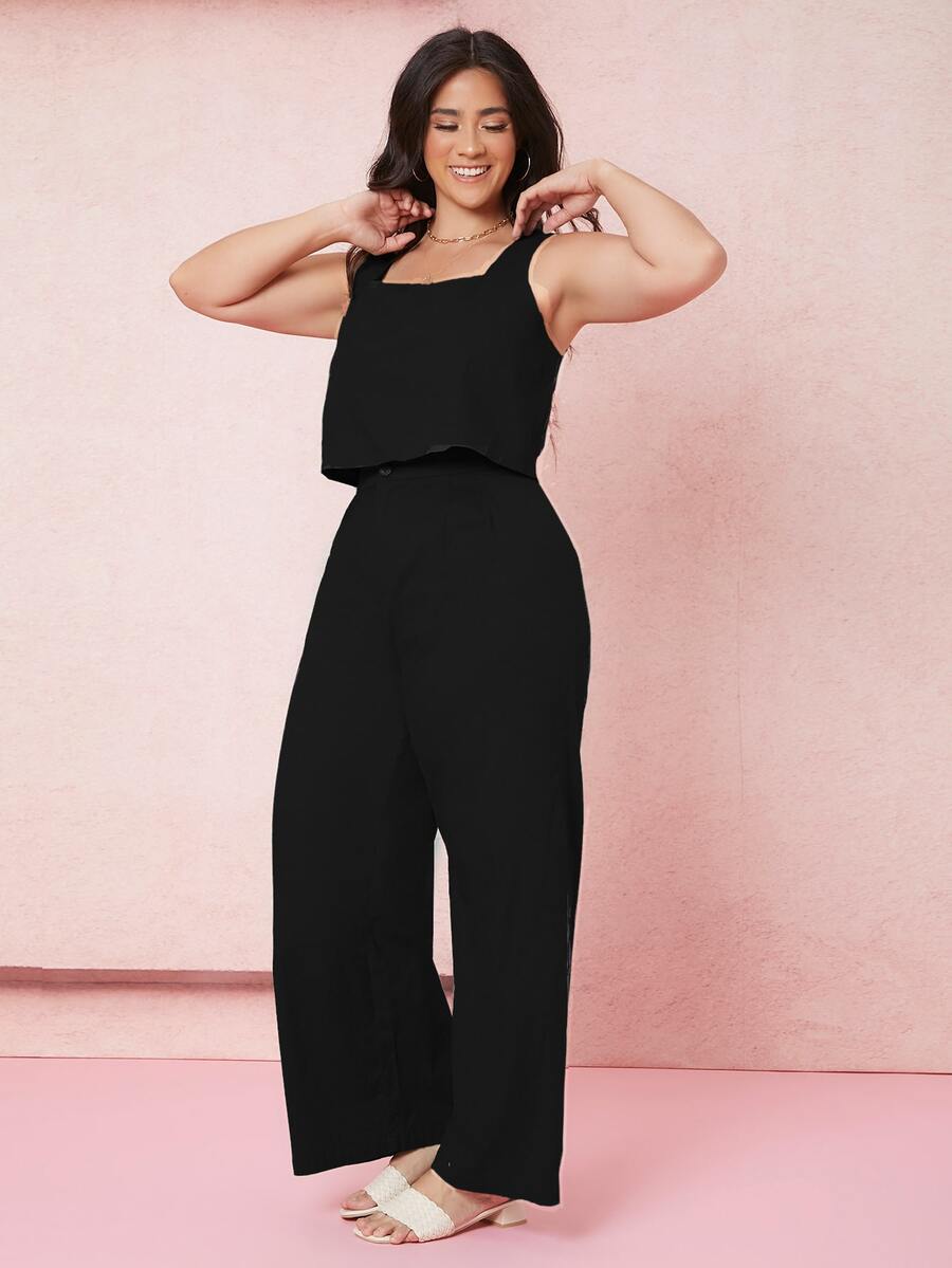 طقم بنطلون بساق عريض مع لباس علوي تانك بلون موحد مقاس كبير