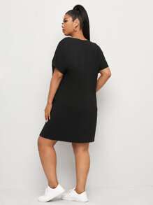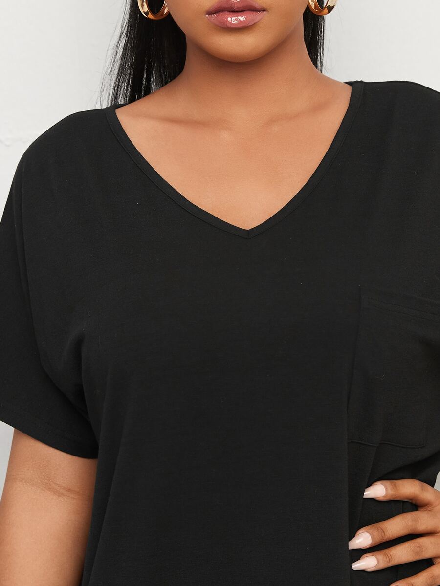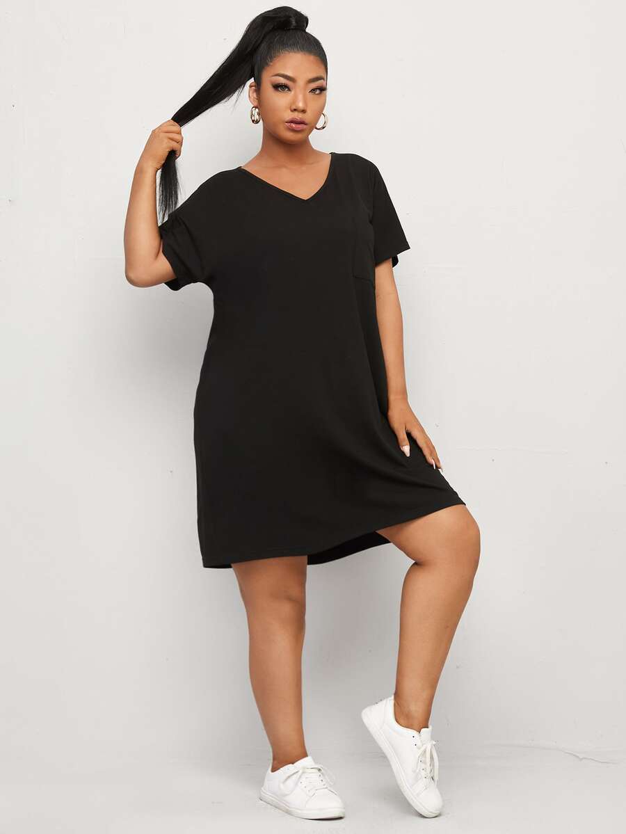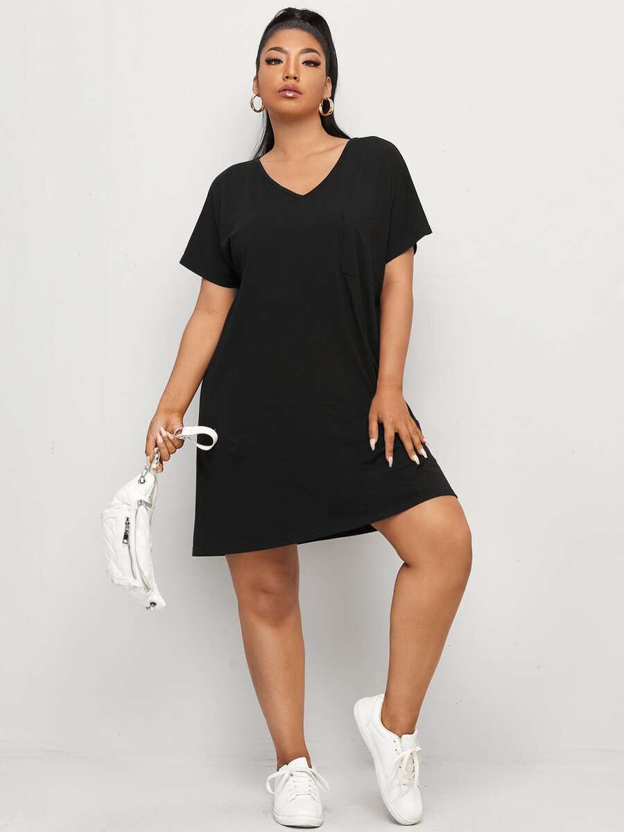 فستان تي شيرت بعنق V وبلون موحد مقاس كبير