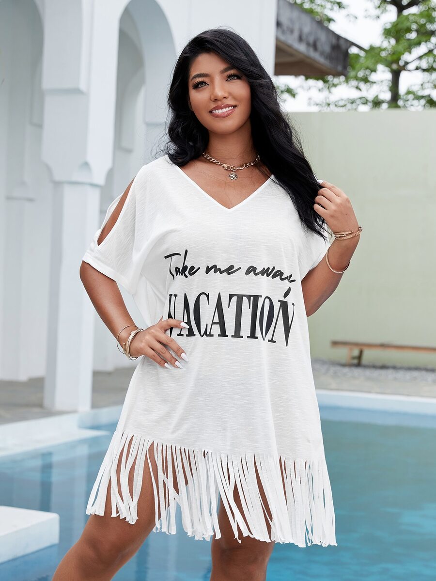 فستان بحافة هدب وبجرافيك شعار باكمام بفتحة مقاس كبير