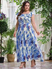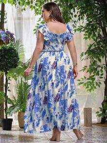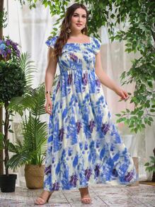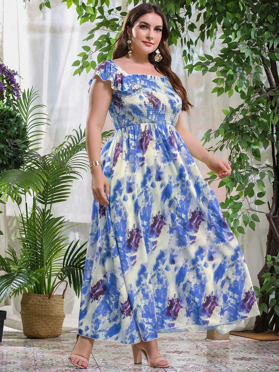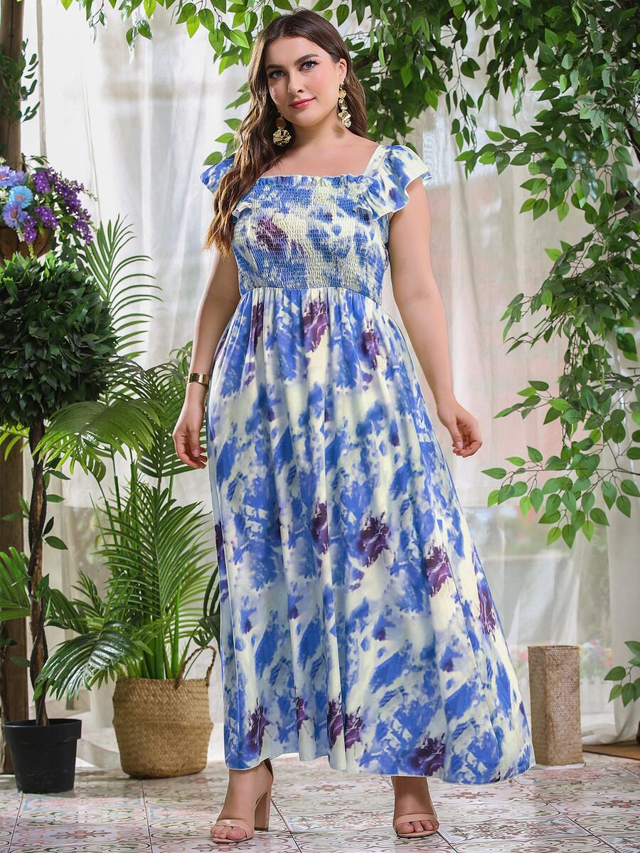 فستان بخط A ماكسي مدرز وبعنق مربع مقاس كبير