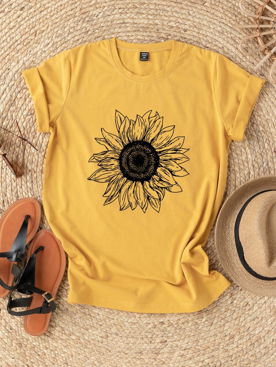 تي شيرت مقاس كبير بطباعة زهرة دوار الشمس