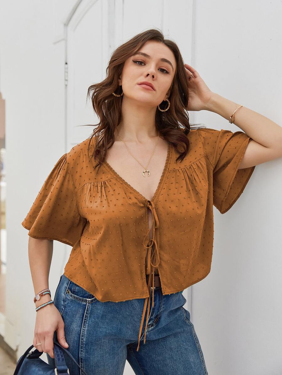 لباس علوي قصير بعقد امامي منقط سويسري مقاس كبير