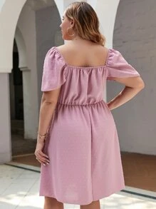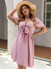 مقاس كبير فستان منقط سويسري ربطة امامية ياقة سويت هارت اكمام فراشة