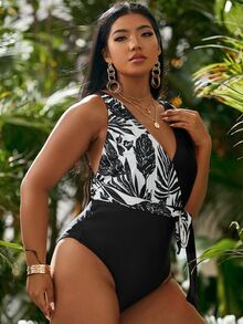 ملابس سباحة قطعة واحدة بخصر معقود وبطباعة استوائي مقاس كبير