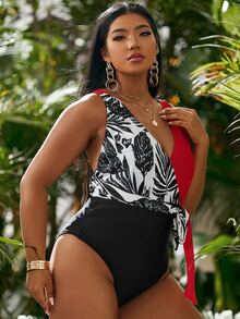 ملابس سباحة قطعة واحدة بخصر معقود وبطباعة استوائي مقاس كبير