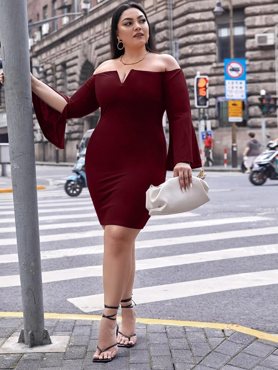 فستان مقاس كبير باكمام مشقوق ومكشوف الكتف مع قص V