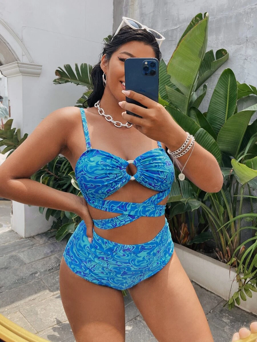 4قطع بيكيني كريس كروس بطباعة موجة مائية مقاس كبير ، صيفي للشاطئ