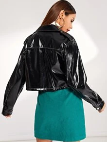 جاكيت نمط المحاصيل من الجلد الصناعي بأزرار وجيب امامي
