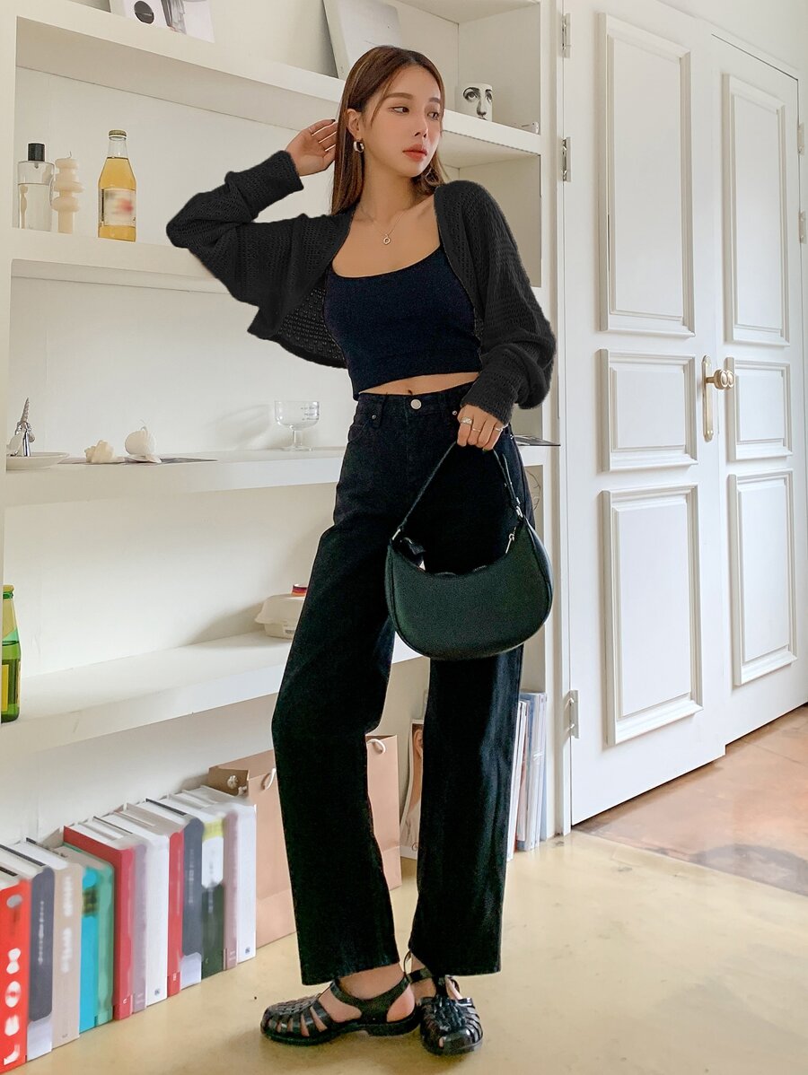 كارديجان قصير أمامي مفتوح بتريكو بوانتيل، ملابس علوية بأكمام طويلة، ملابس خريفية