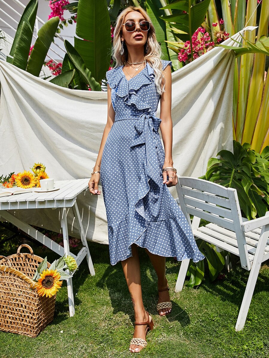 فستان بحزام بحافة مكشكشة بنقاط البولكا