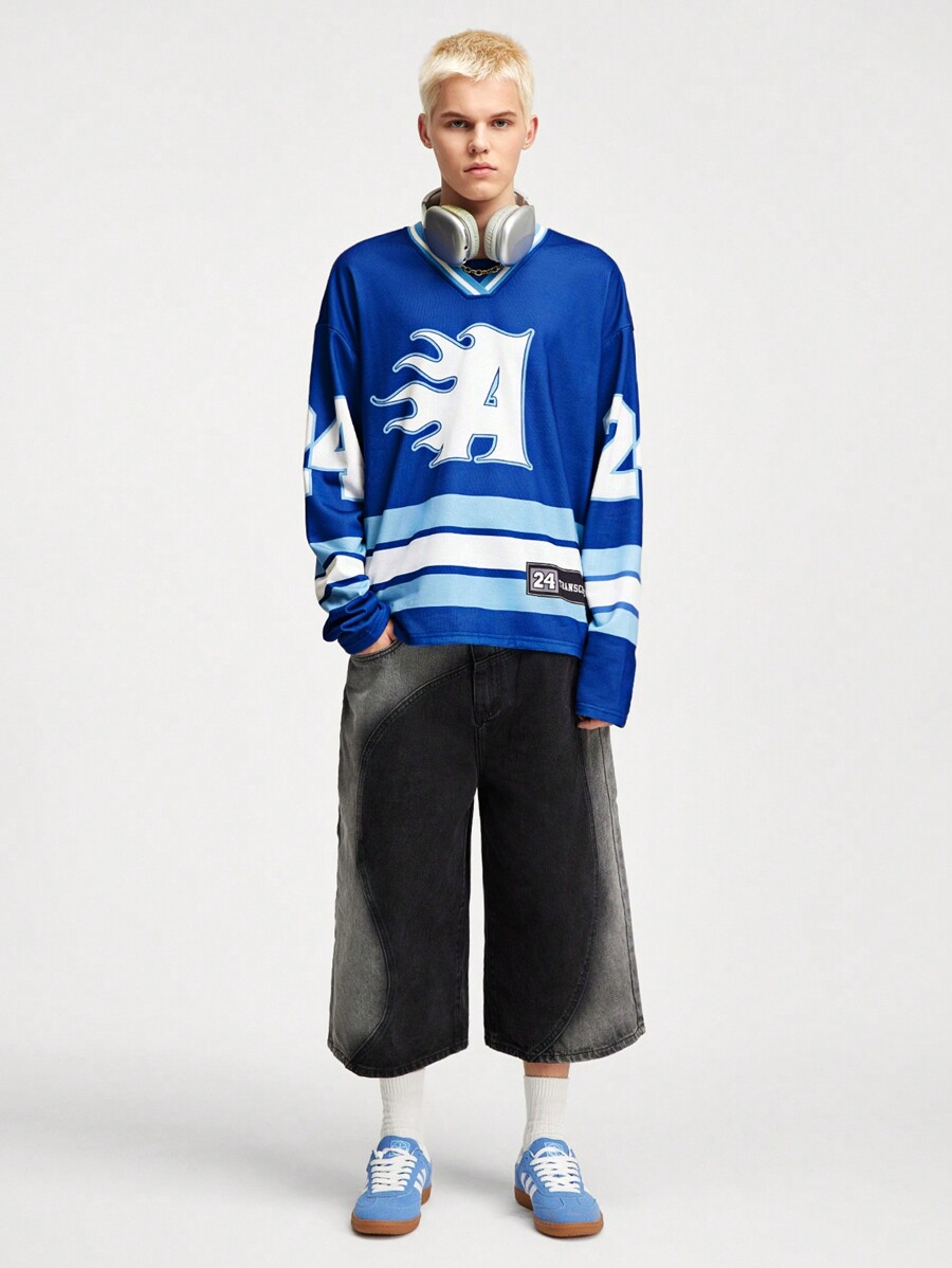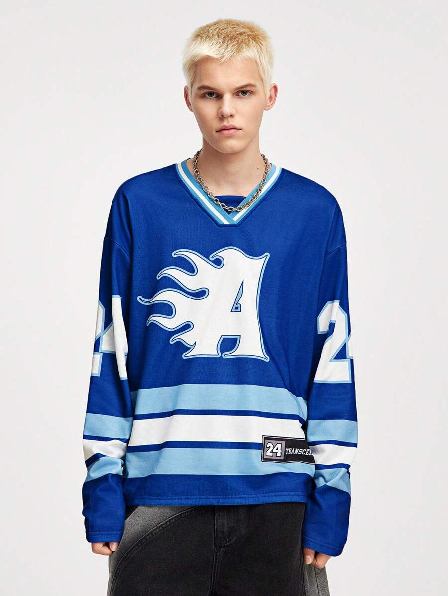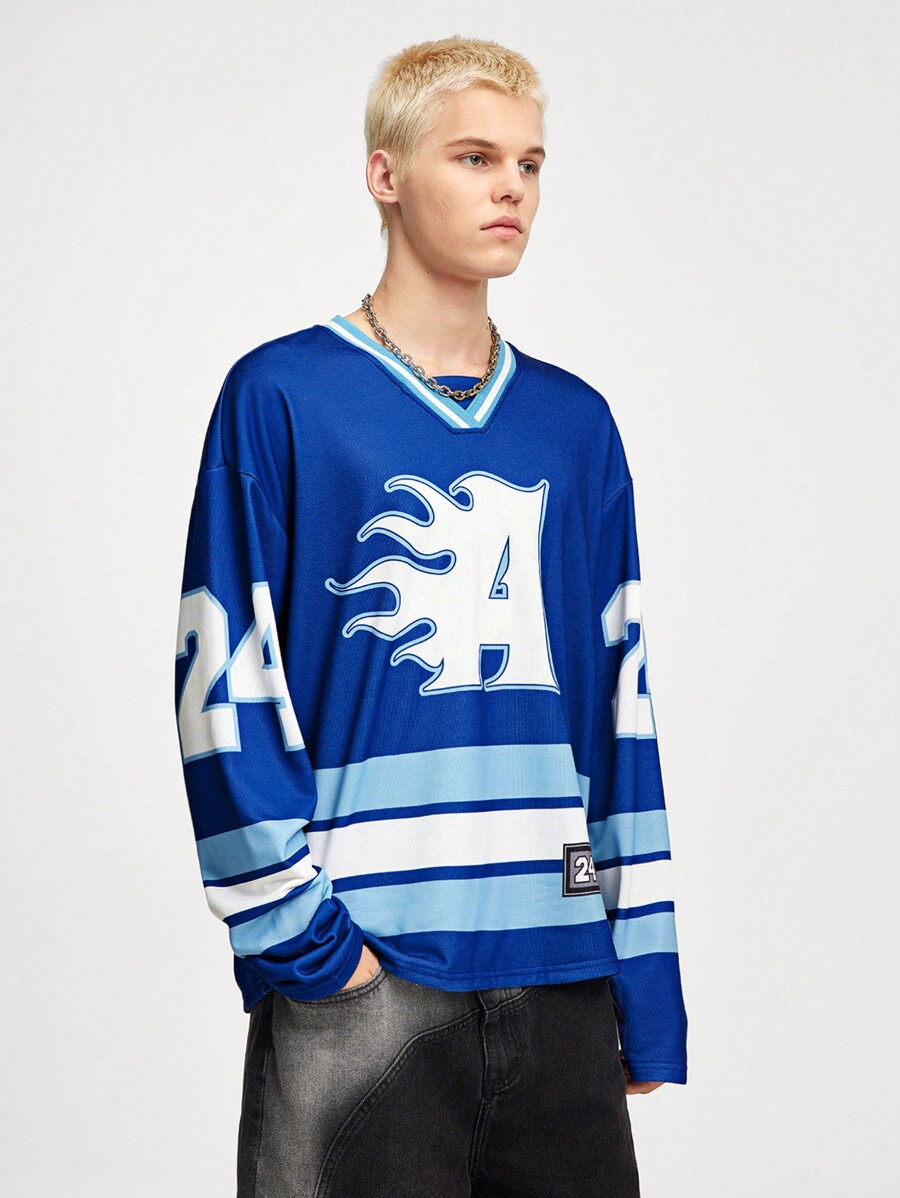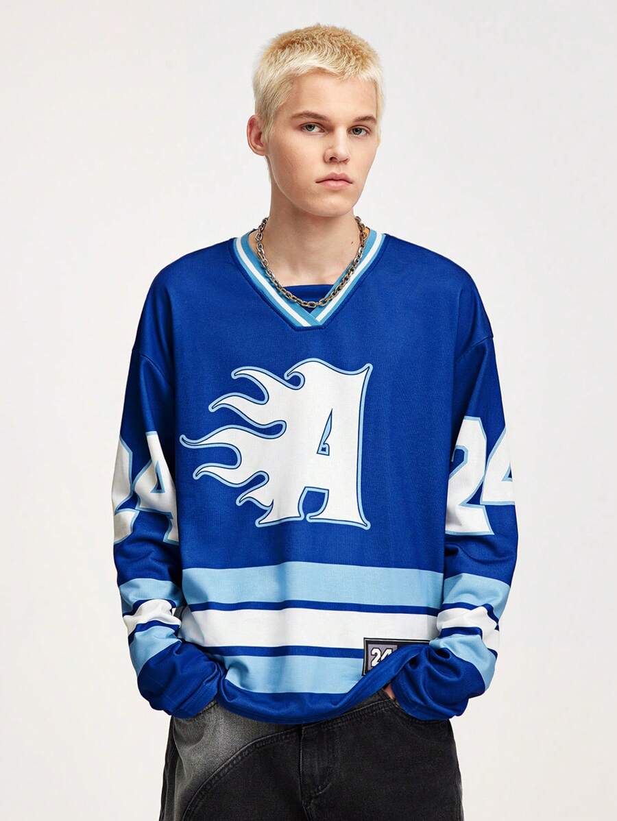 Prep بلوزة رياضية بياقة على شكل حرف V وبطباعة حرفية، طويلة الأكمام، بأكتاف متدلية، للرجال، للربيع والخريف