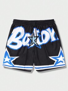 Prep شورت رياضة كرة السلة للرجال مع خطوط بتباين الألوان وطباعة حروف مع رباط في الوسط