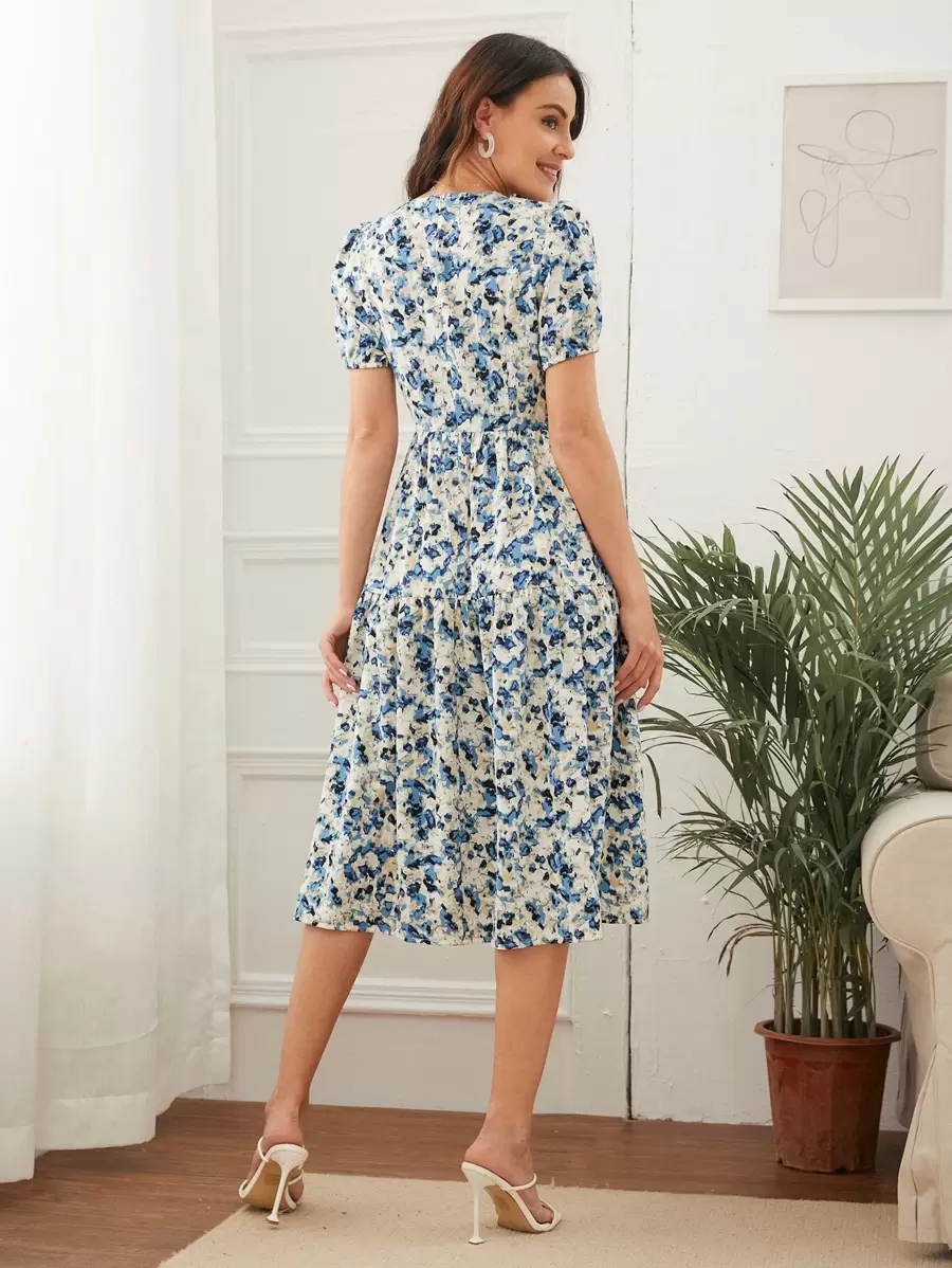 فستان بطباعة شامل وبأكمام منفوخ