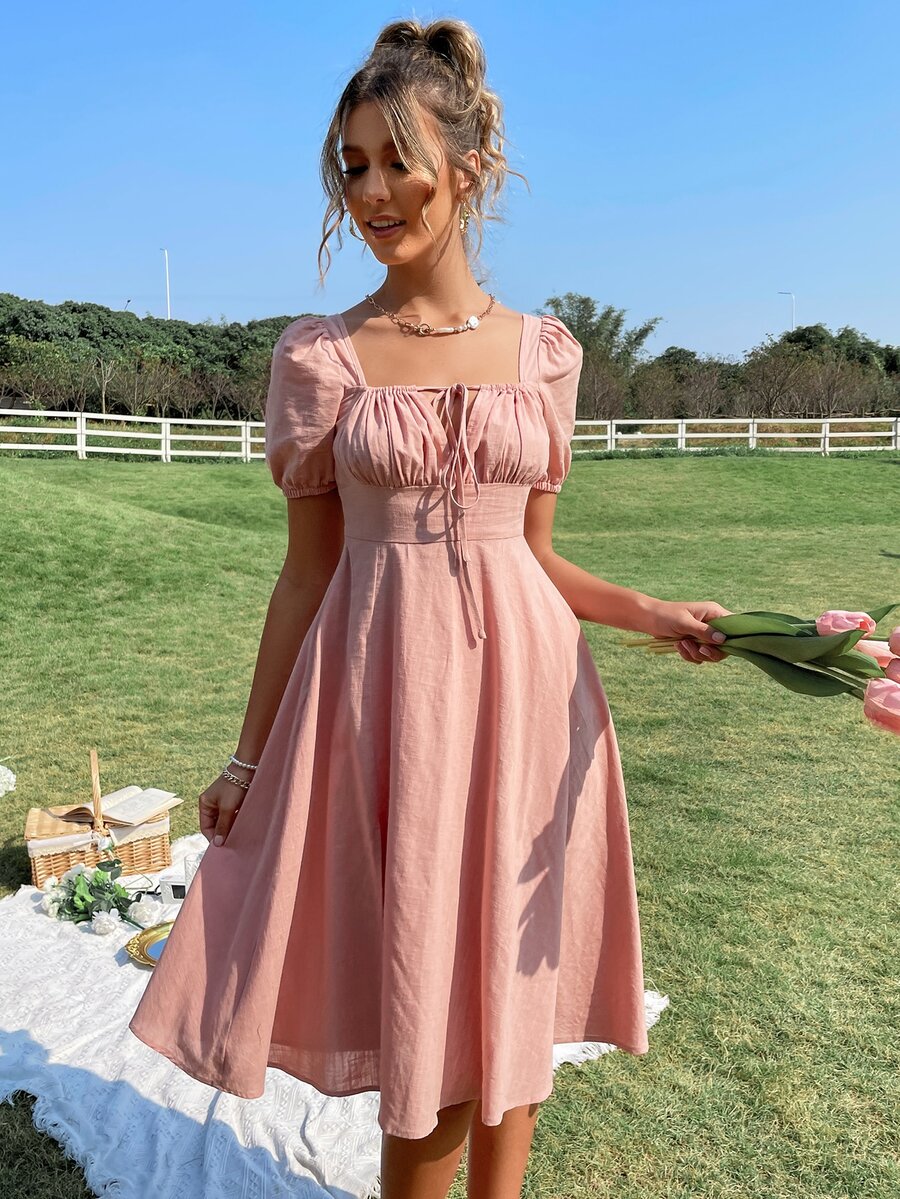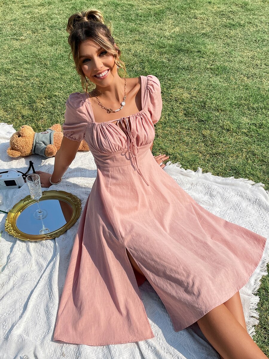 فستان ماكسي للسيدات بأكمام منفوخة، عقدة أمامية، ثني في الجزء العلوي، شق في الجانب العلوي للفخذ