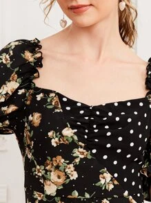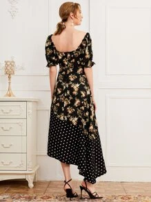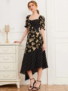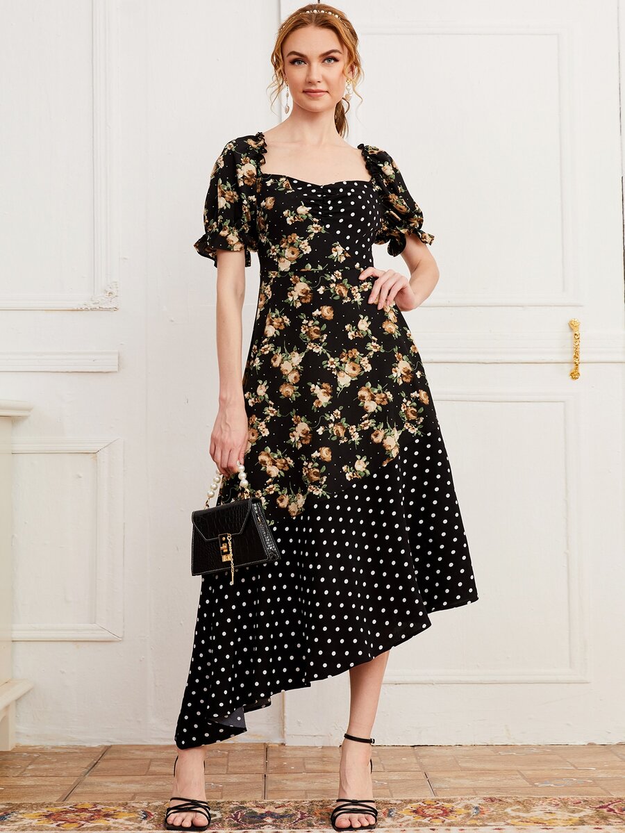 فستان بحافة غير متماثل منقط ومزهر وبعنق سويت هارت وبأكمام منفوخ