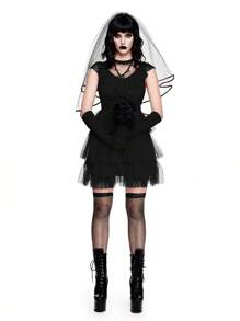 ROMWE Avant فستان زفاف متعدد الطبقات من الدانتيل والتول مع فيونكة، ثوب عروس تنكري، ملابس تنكرية لحفلة هالوين، طقم ملابس غوثي مخيف وغامض