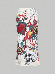 ROMWE Avant تنورة قصيرة للنساء مطبوع عليها نص بشكل قلب هيكل عظمي ولهب بطراز Y2K الرجعي