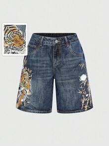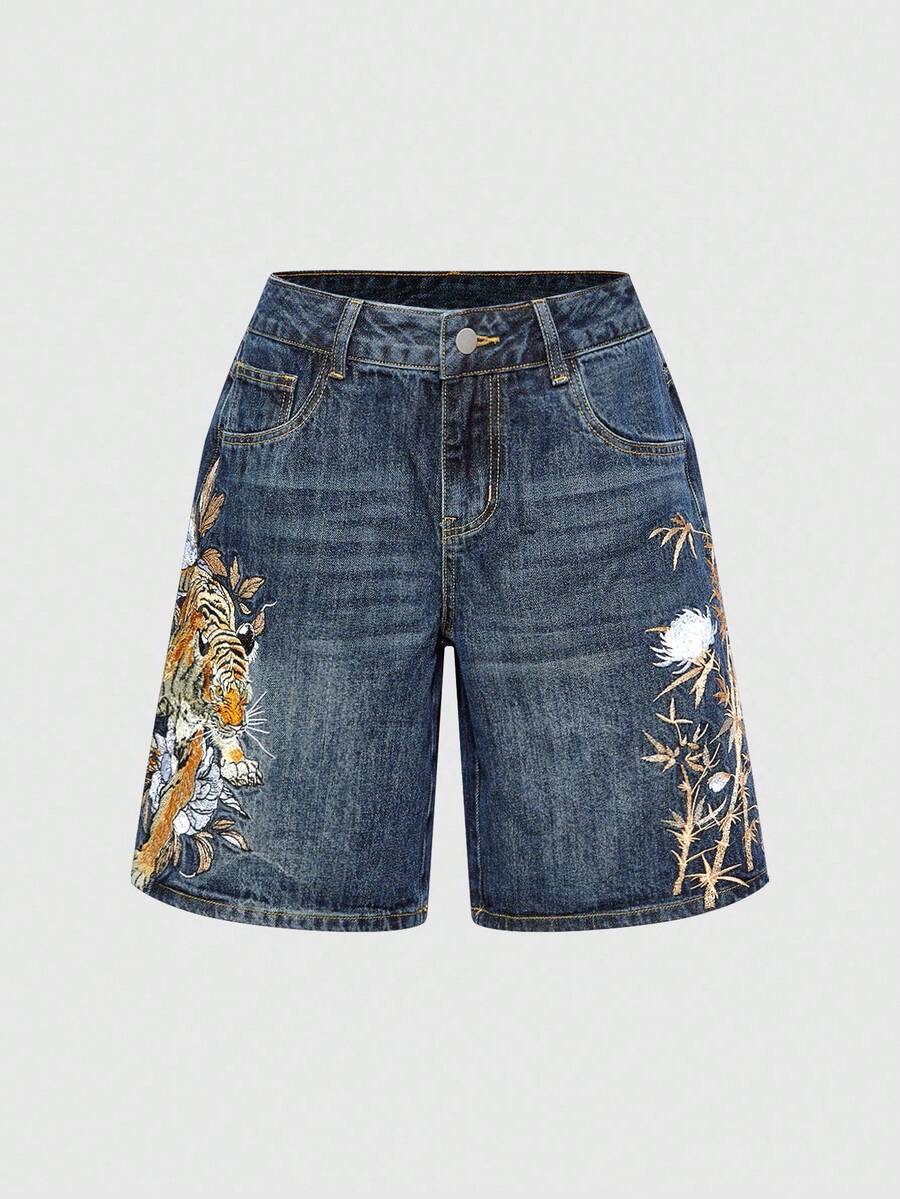 ROMWE Avant بنطلون جينز واسع الساق منخفض الخصر بطراز صيني مطرز بالنمر والزهور، مناسب للجنسين