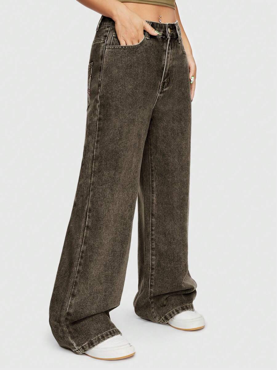 ROMWE Avant بنطال نسائي بقصة مستقيمة ولون سادة مع شعار بين آرات خطي مطرز، ملابس عادية