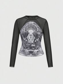 ROMWE Avant ملابس علوية نسائية بطبعة بوذا ذات طابع شرقي صيني