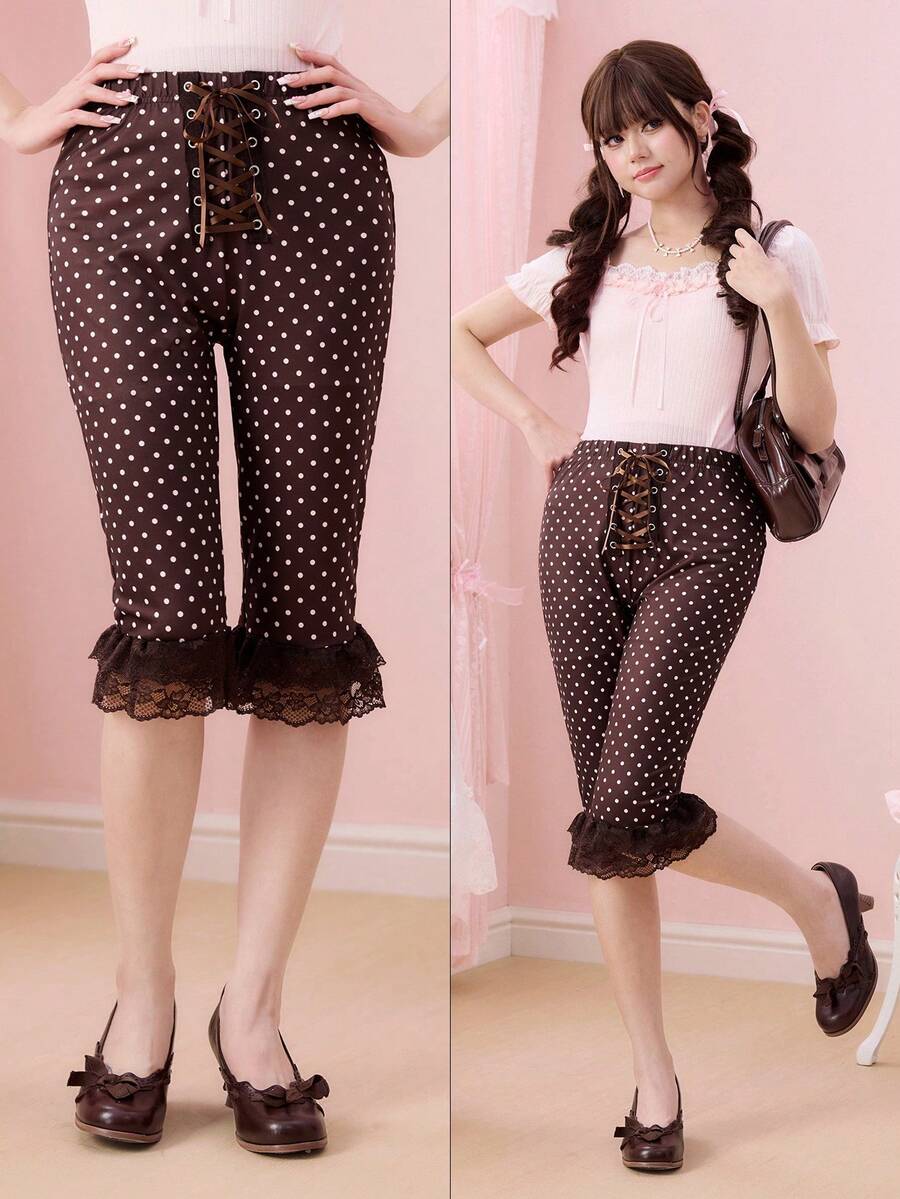 ROMWE Avant بنطلون كابري نسائي بتصميم ربط مع رقعات من الدانتيل وتلوين نقاط مميز لطراز الألفية الجديدة