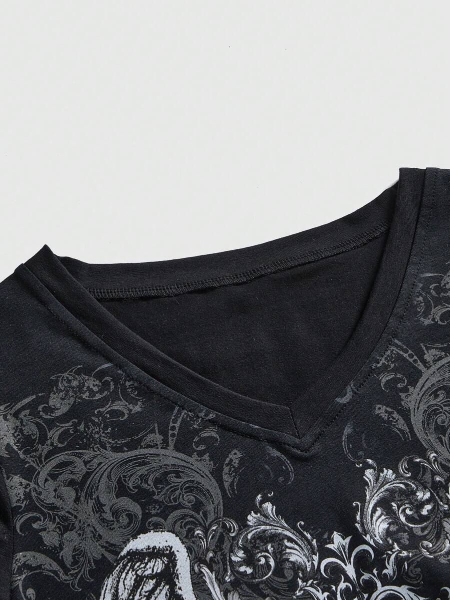 ROMWE Avant تي شيرت نسائي بأكمام قصيرة قوطي Y2K مطرز بقلوب وأجنحة بالراين عالي التركيب ذو رقبة على شكل حرف V