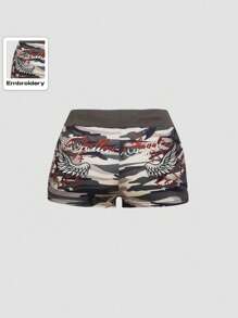 ROMWE Avant سروال قصير منخفض الخصر للنساء مزين بطباعة كاموفلاج جذاب ومطرز بالأجنحة والصليب لطراز Y2K