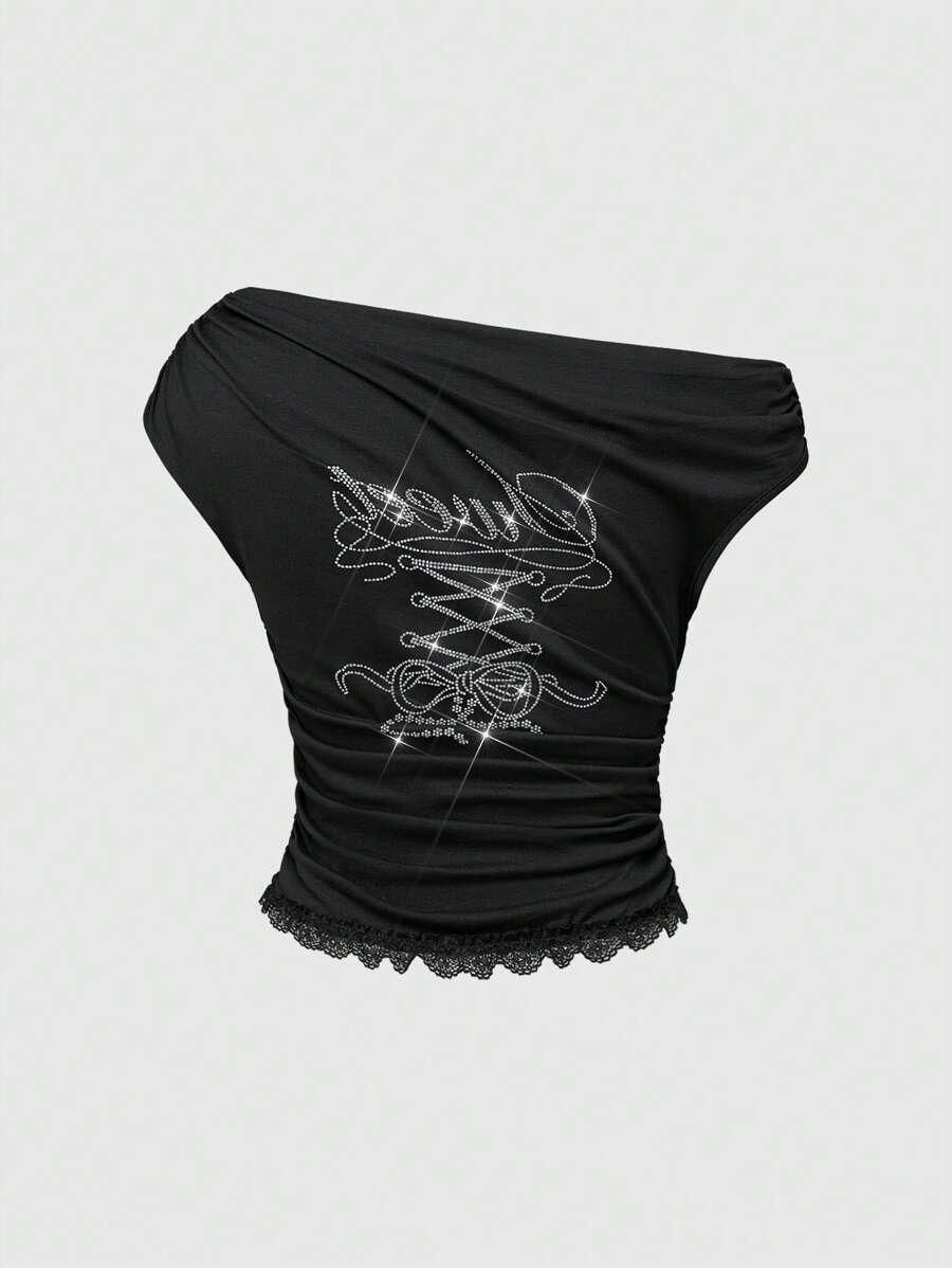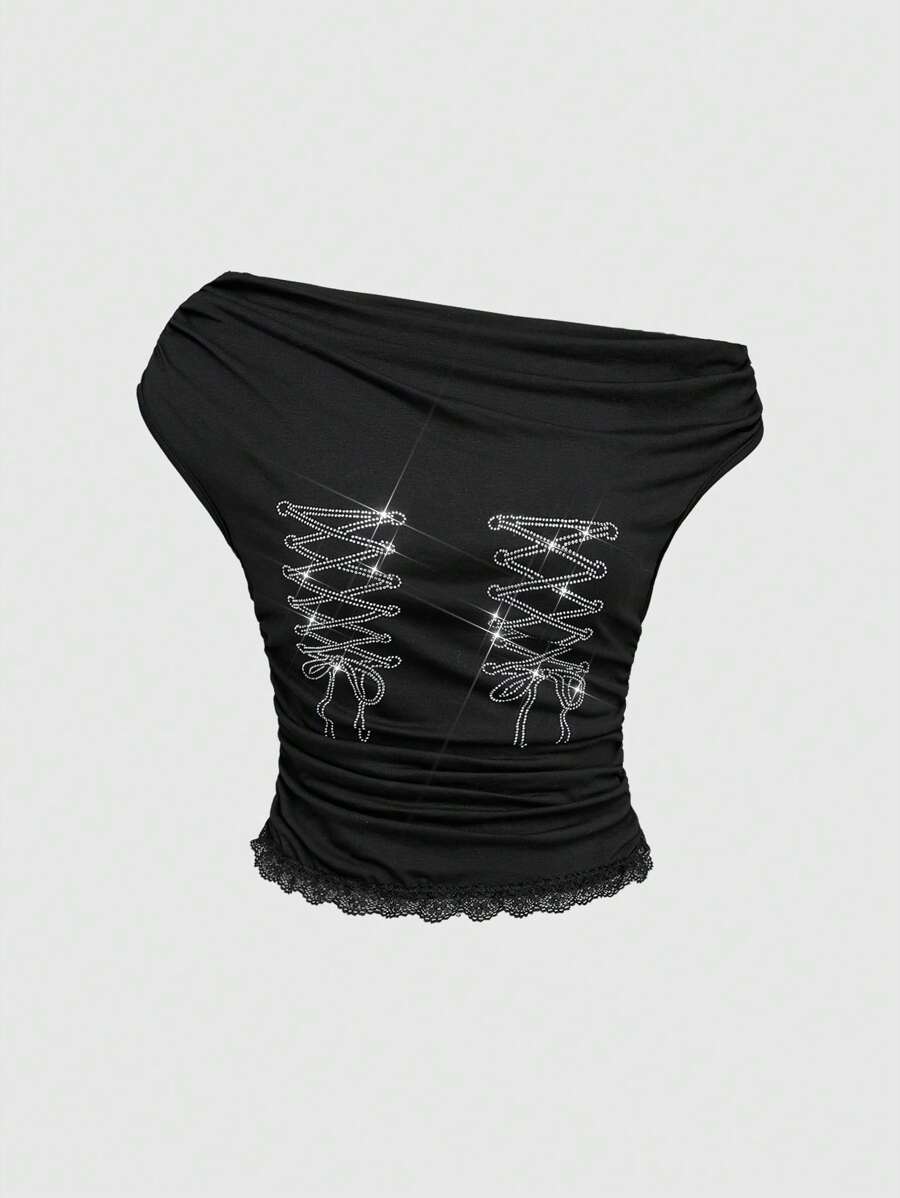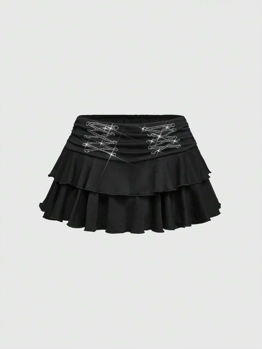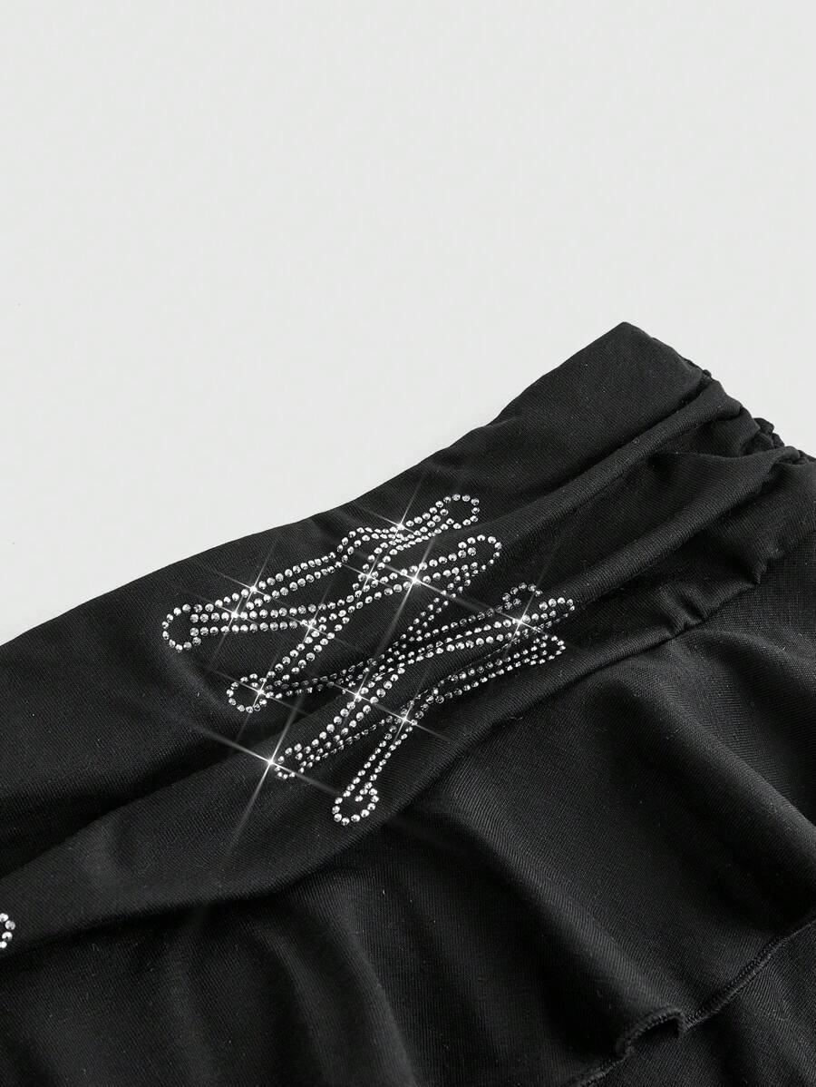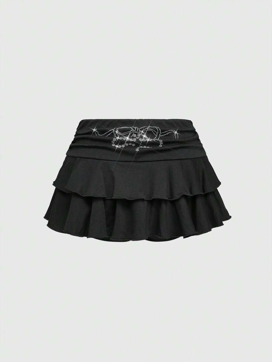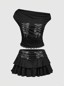 ROMWE Avant طقم لون ملابس للنساء مكون من 2 قطع، تيشيرت كتف غير متماثل بأسلوب Y2K، تنورة كيكة واطئة مزينة بالزخارف لامعة