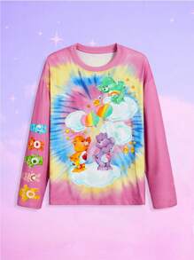 ROMWE X Care Bears تي شيرت طويل الأكمام بأكتاف منسدلة مطبوع عليه دب كرتوني وطباعة صبغ التعادل سمات كبيرة