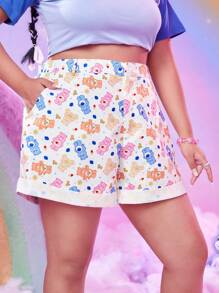 ROMWE X Care Bears Plus Heart & Cartoon Graphic Roll Up Hem Shorts