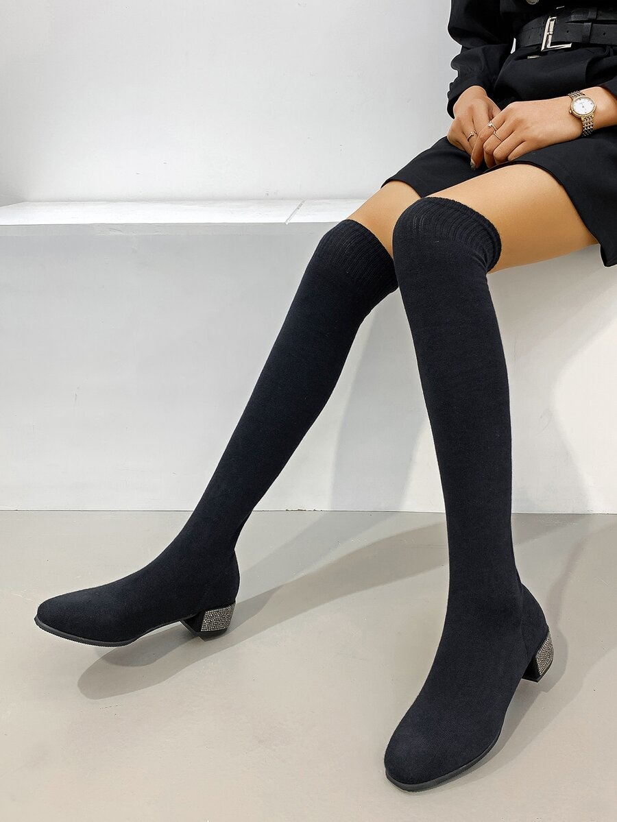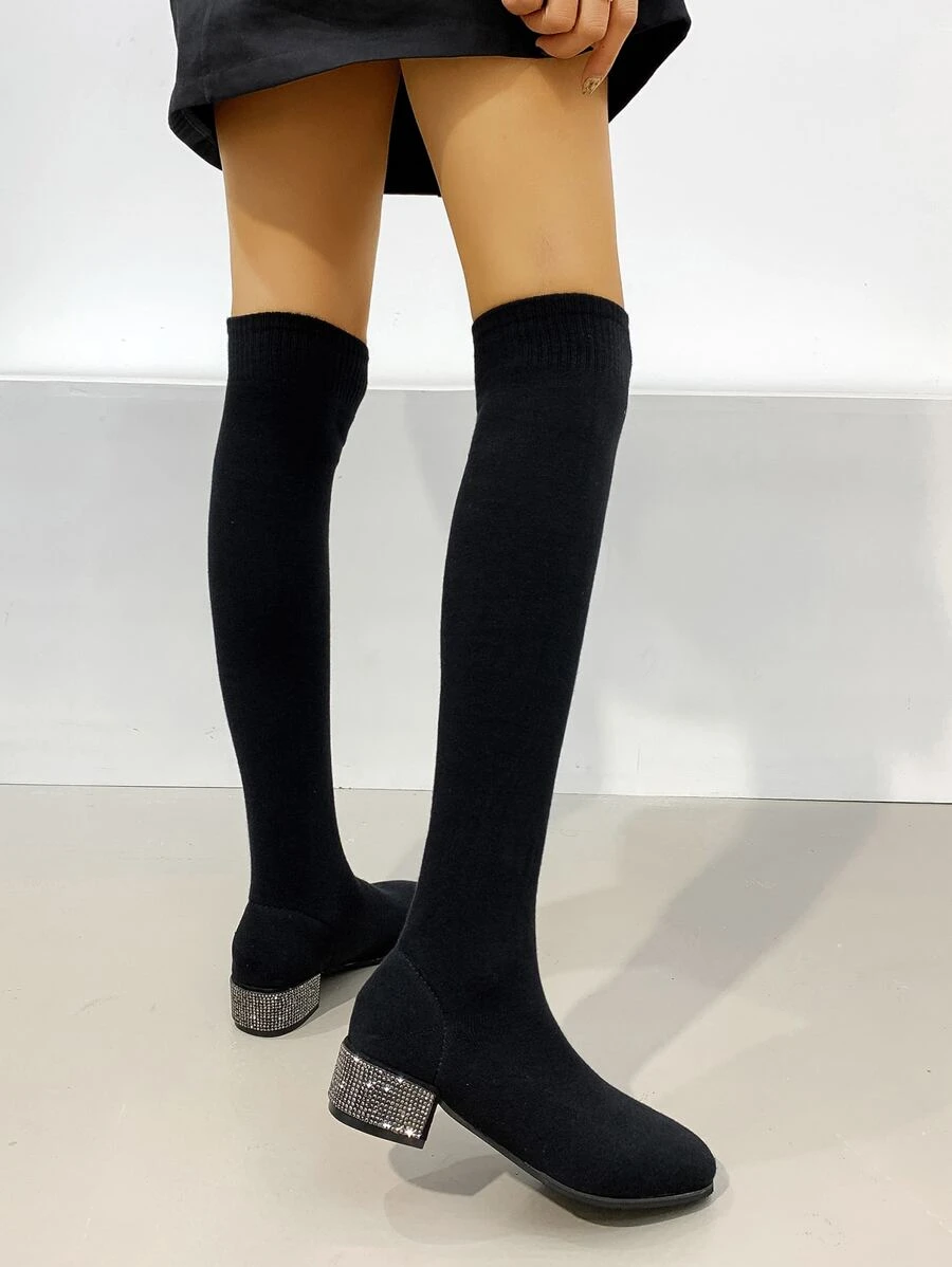 جزمه قماش فوق الركبة بكعب مكتنز بحجر الراين