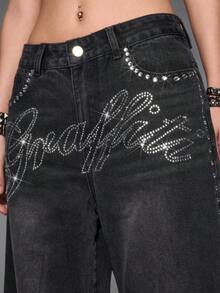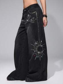 Grunge Punk جينز واسع الساق مريح متعدد الاستخدامات مزين بالراين ستون