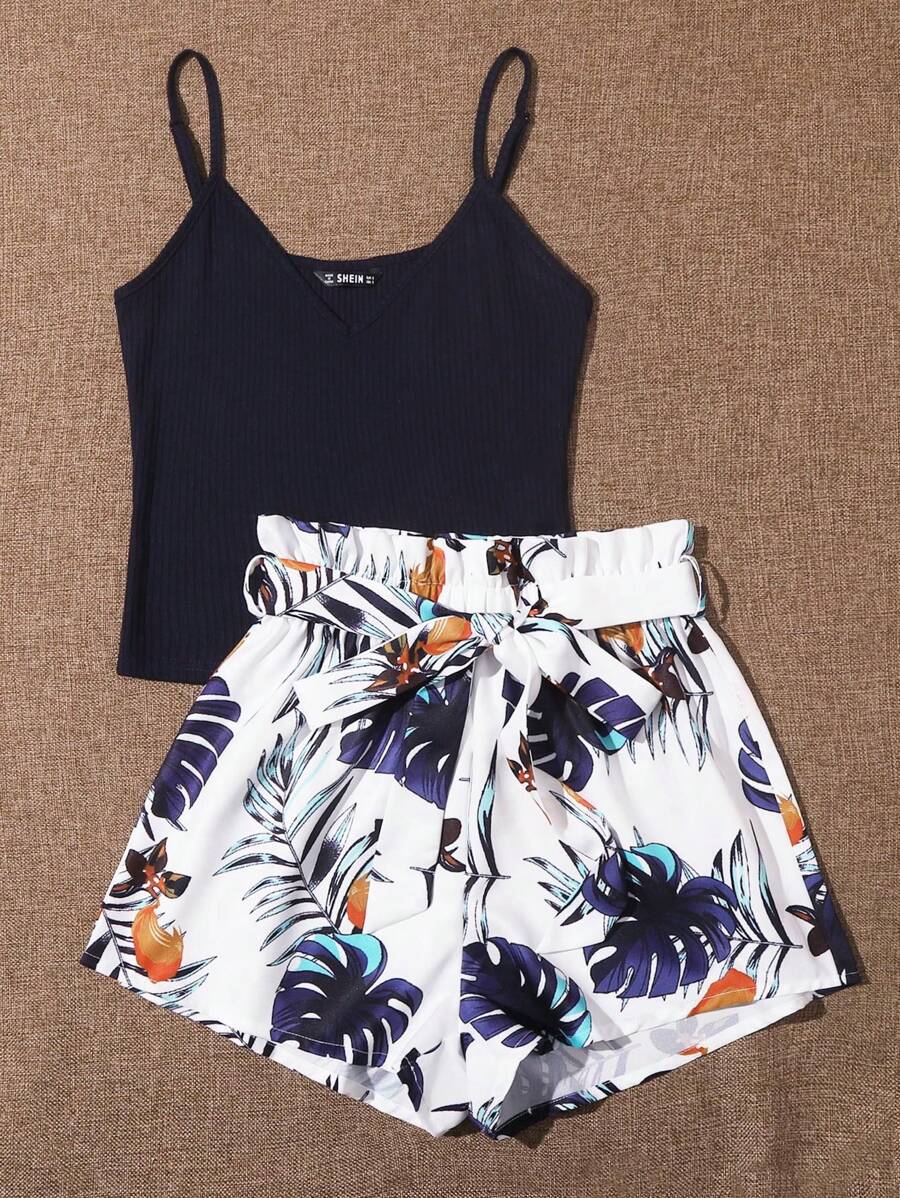 قميص نسائي بدون أكمام برقبة V وشورت مطبوع بنباتات استوائية ربطات ، مجموعة الشاطئ مكونة من قطعتين