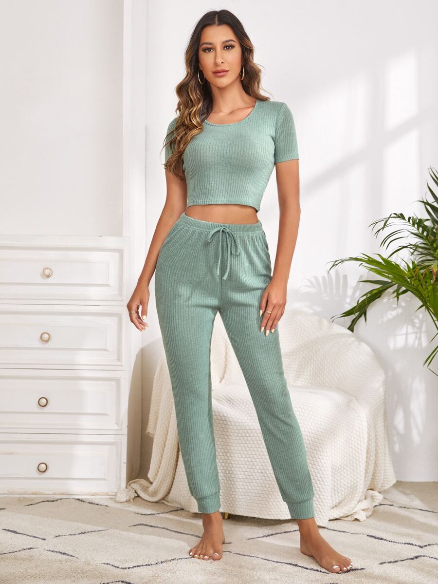 بذلة بللوك ممتد من قميص محبوك والسراويل ذات الخصر المربوط للراحة