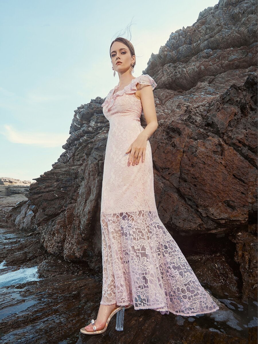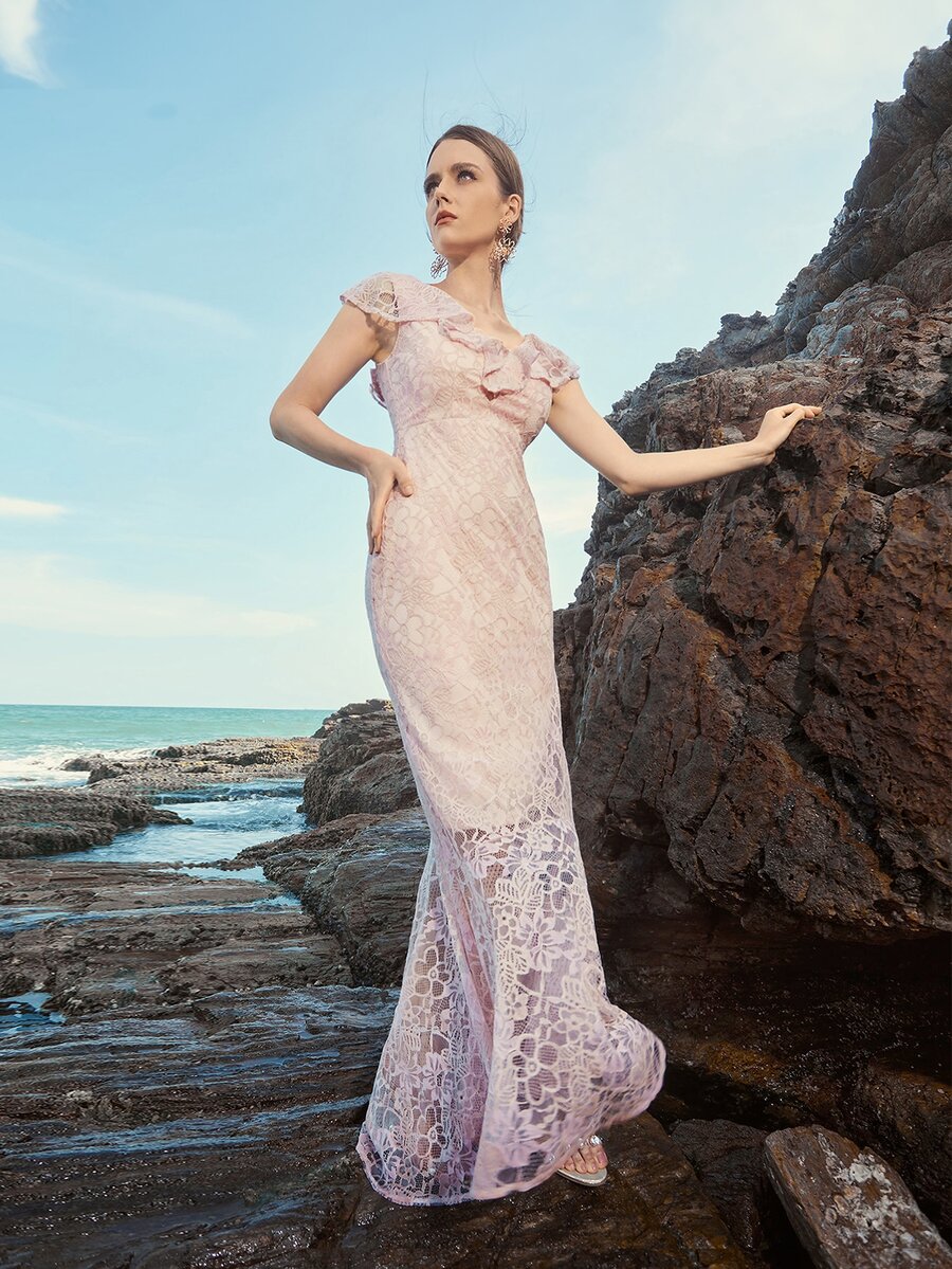 فستان حفلة حورية البحر بدانتيل مقلم مكشكش